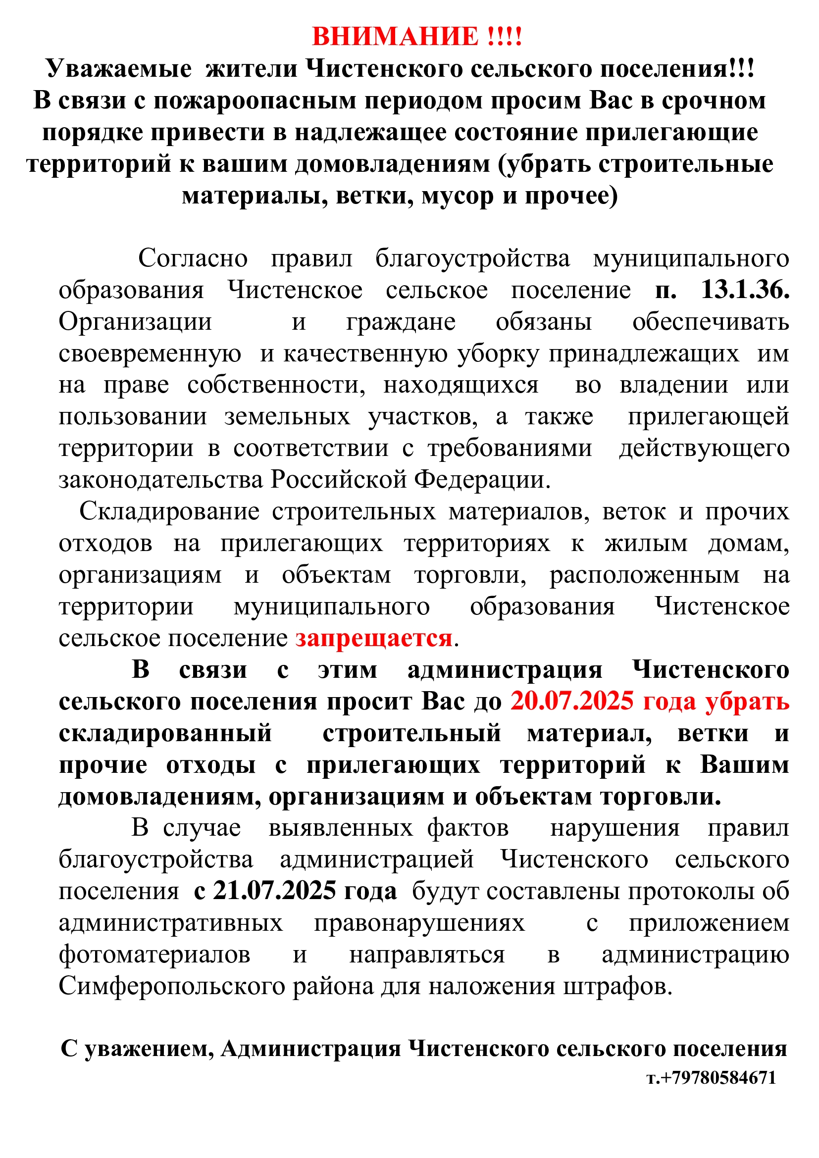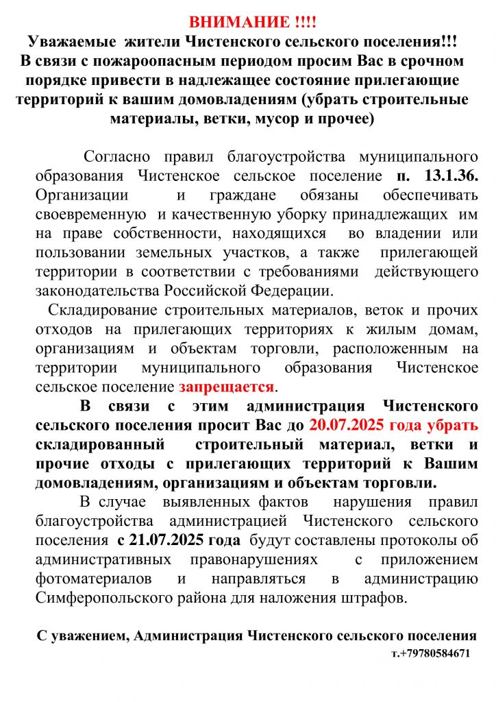 Уважаемые жители Чистенского сельского поселения!!! В связи с пожароопасным периодом просим Вас в срочном порядке привести в надлежащее состояние прилегающие территорий к вашим домовладениям (убрать строительные материалы, ветки, мусор и прочее)